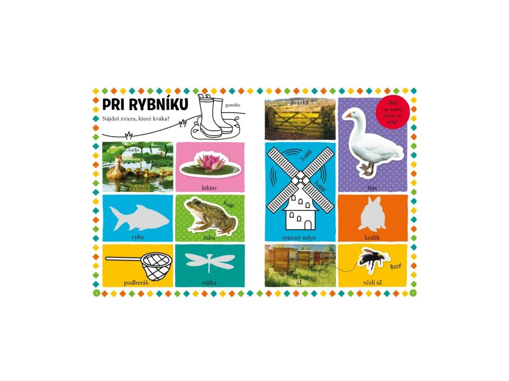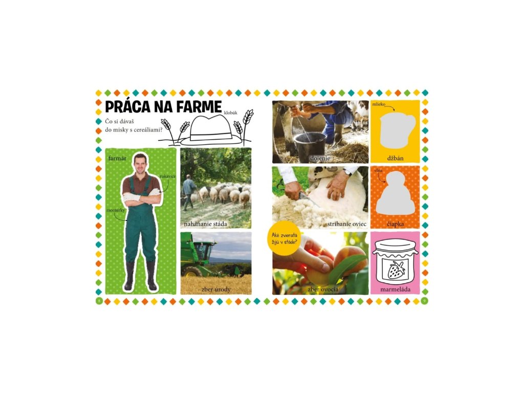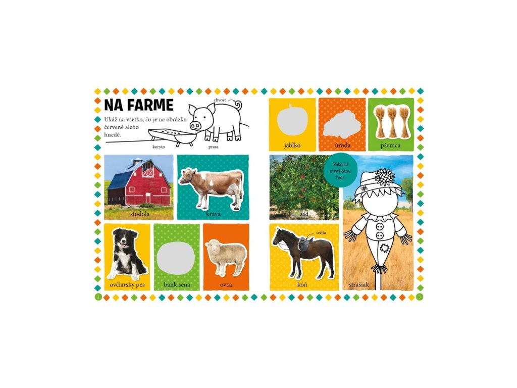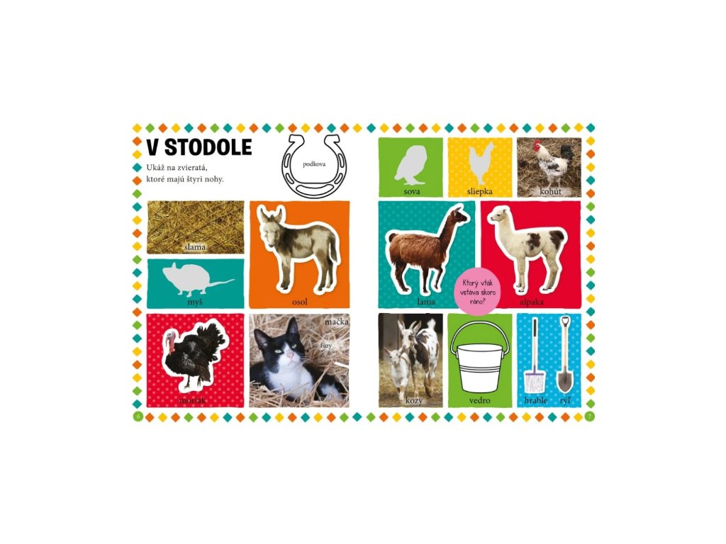 Výrazné obrázky a fotografie zvierat a predmetov z farmy vo farebných rámčekoch s popismi predstavia deťom 100 prvých slov z tohto prostredia.
