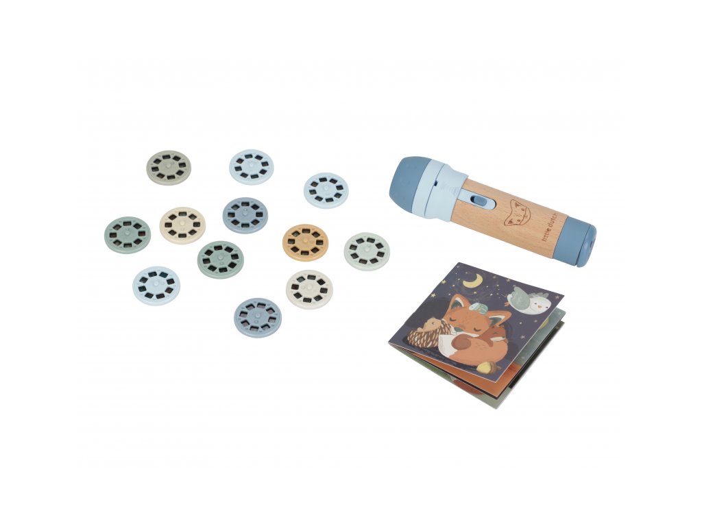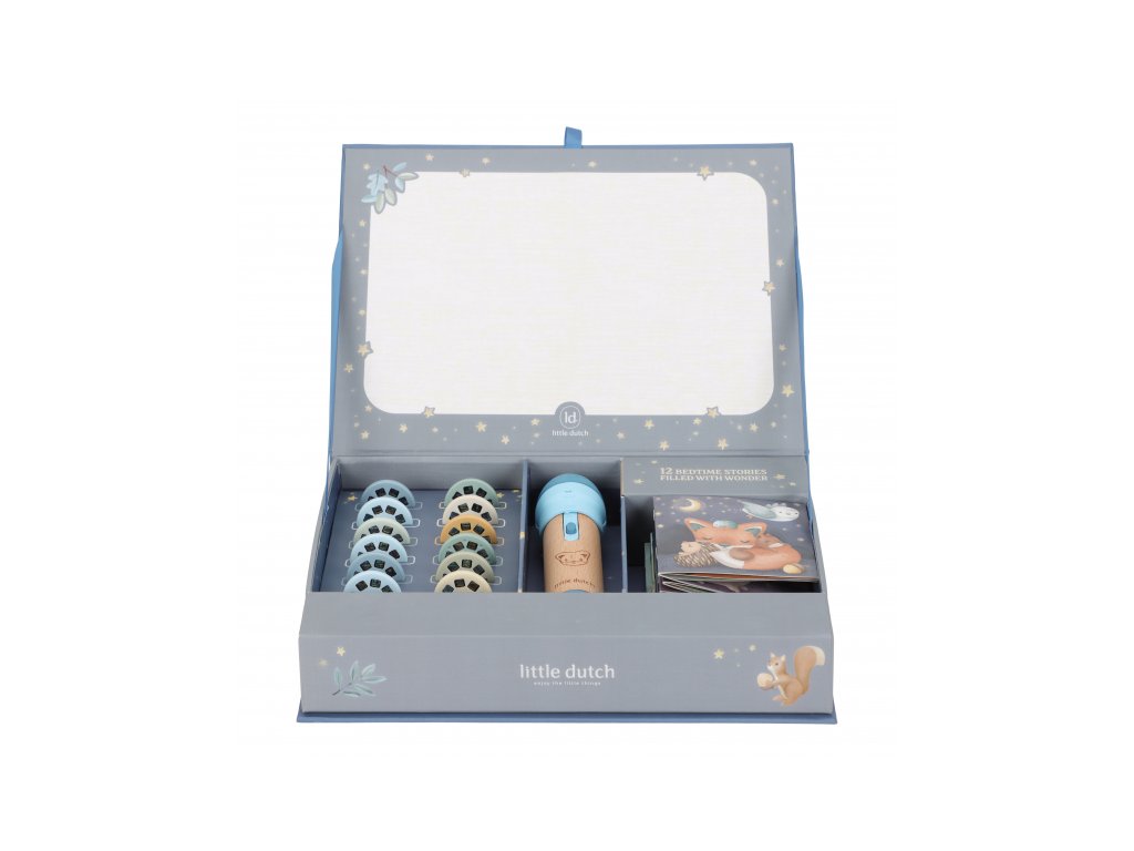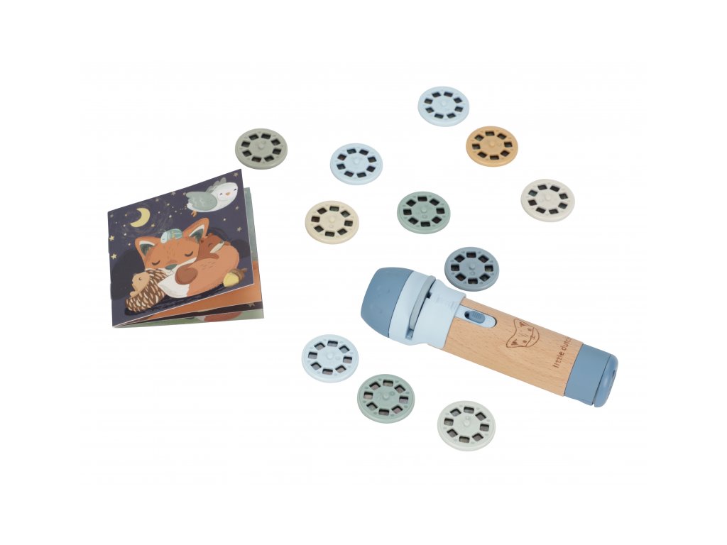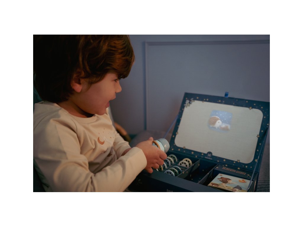 Projektor má pevnú drevenú rukoväť a funguje na batérie, takže si ho deti môžu vziať kamkoľvek so sebou. Po skončení príbehu je možné baterku aj všetko príslušenstvo ľahko uložiť do krásneho úložného boxu. Ideálny pre upokojujúci rituál pred spaním alebo príjemné spoločné chvíle.