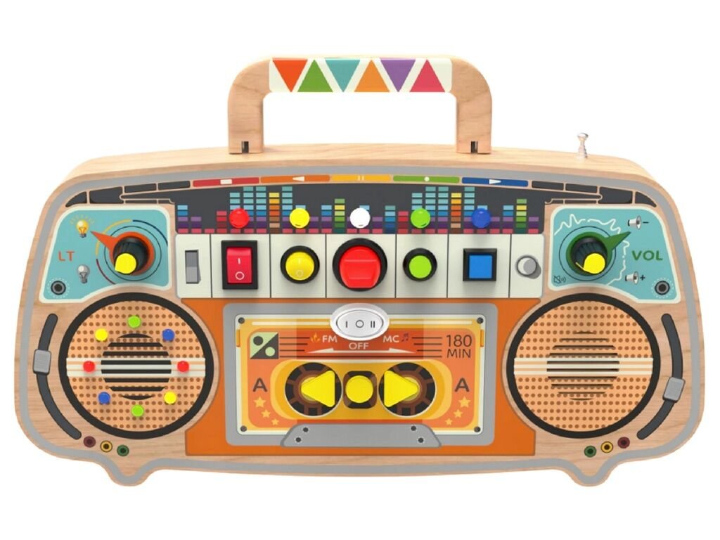 Tento originálny drevený activity board v štýle retro rádia okamžite upúta pozornosť najmenších detí vďaka senzorickému LED panelu s farebnými svetielkami a svietiacimi tlačidlami. Chytro navrhnutá kombinácia interaktívnych prvkov, ako sú otočné gombíky, prepínače, posúvače, štýlové reproduktory, podporuje rozvoj jemnej motoriky, zmyslové vnímanie, kreativitu a hudobný sluch.