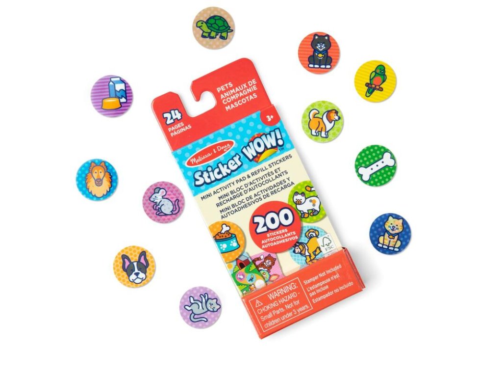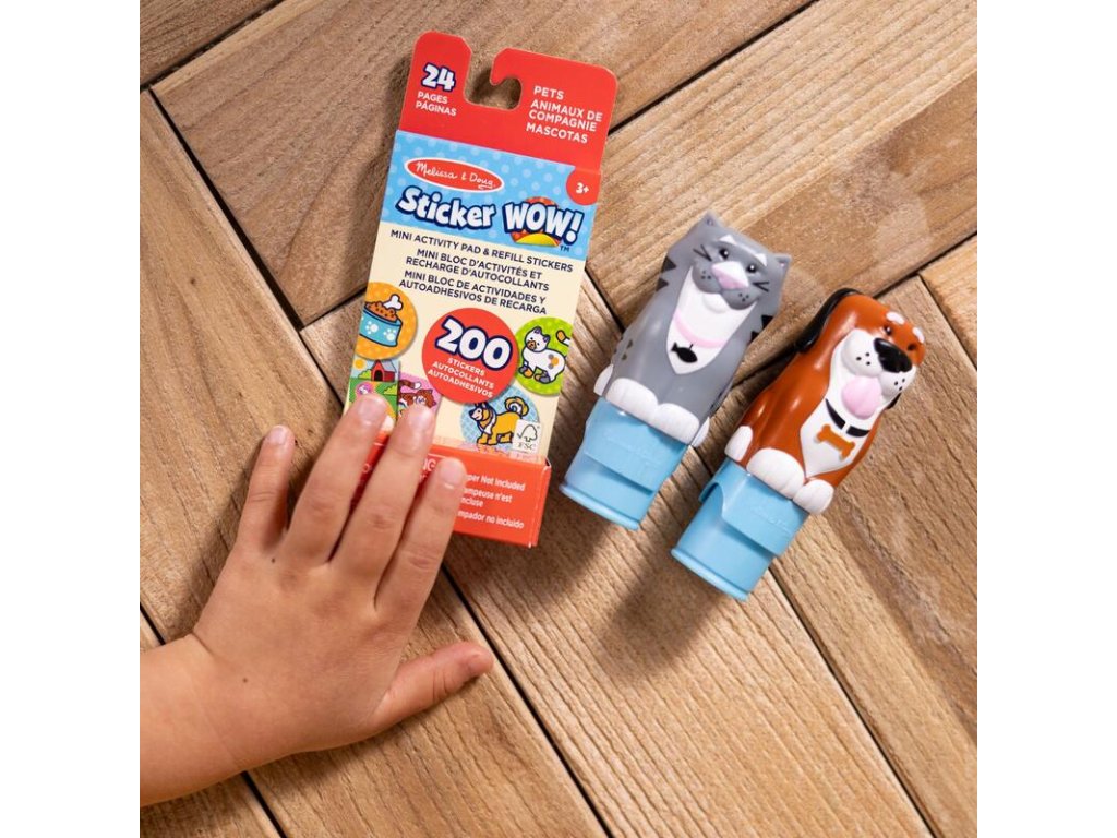 Doplňte akýkoľvek razítkovač Melissa & Doug Sticker WOW!™ (nie je súčasťou dodávky) 200 najrôznejšími doplňovacími nálepkami s tématikou domácich maznáčikov a pečiatkujte, kdekoľvek a kedykoľvek.